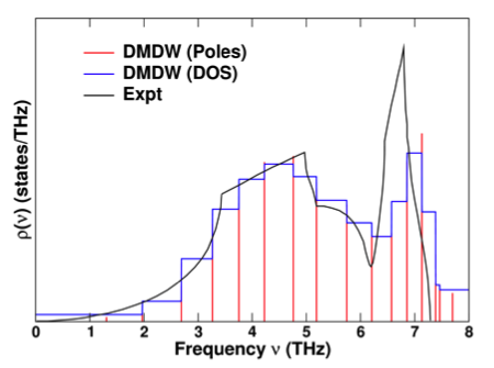 Left: Dynamical matrix (in pole and continuous representations) and experimental phonon density of states.