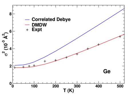 Right: Correlated Debye, dynamical matrix and experimental near neighbor DW factor in Ge.